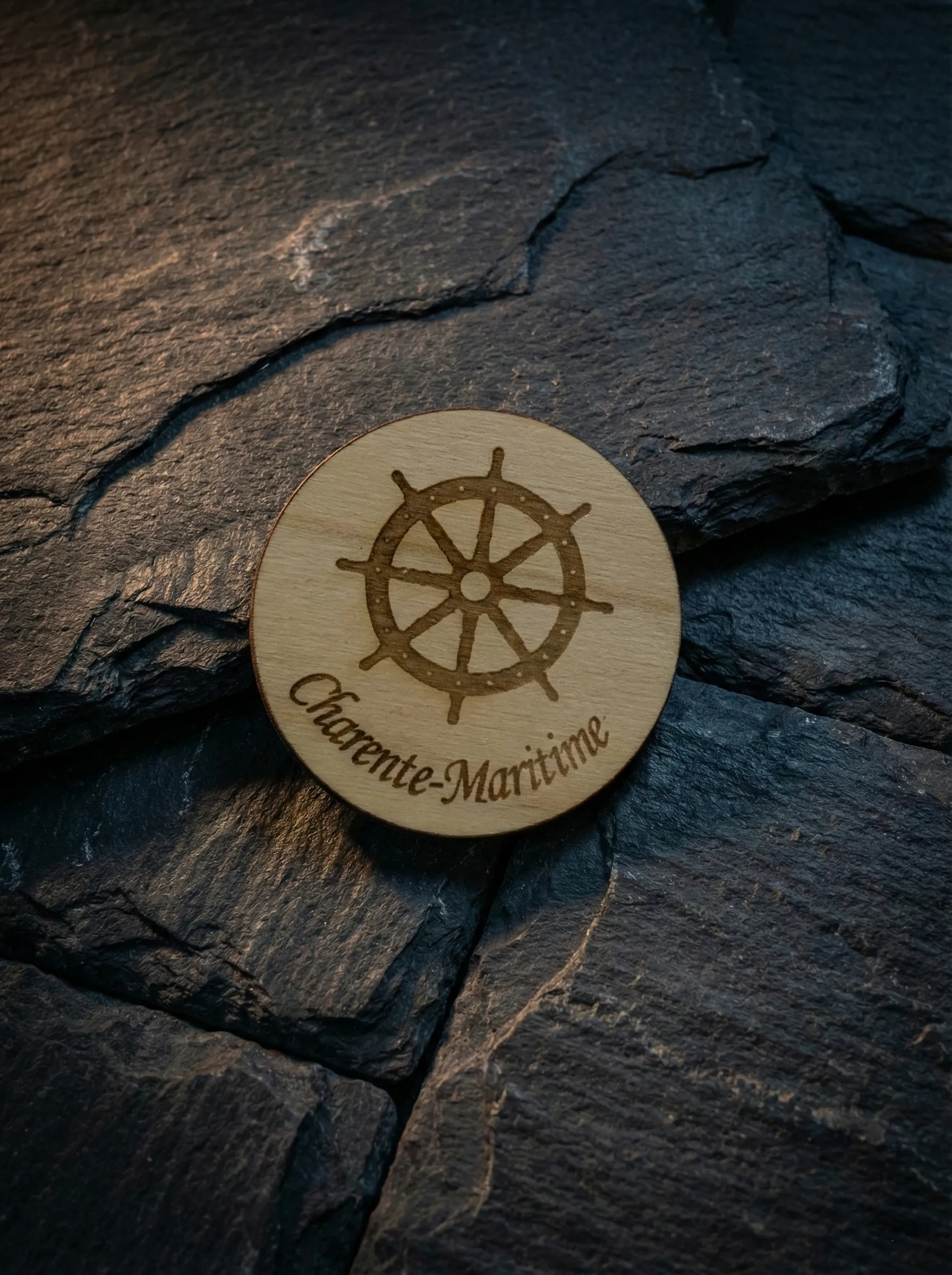 Magnet décoratif en bois de peuplier, diamètre 40 mm, épaisseur 3 mm. Gravé et fabriqué artisanalement en Charente-Maritime.