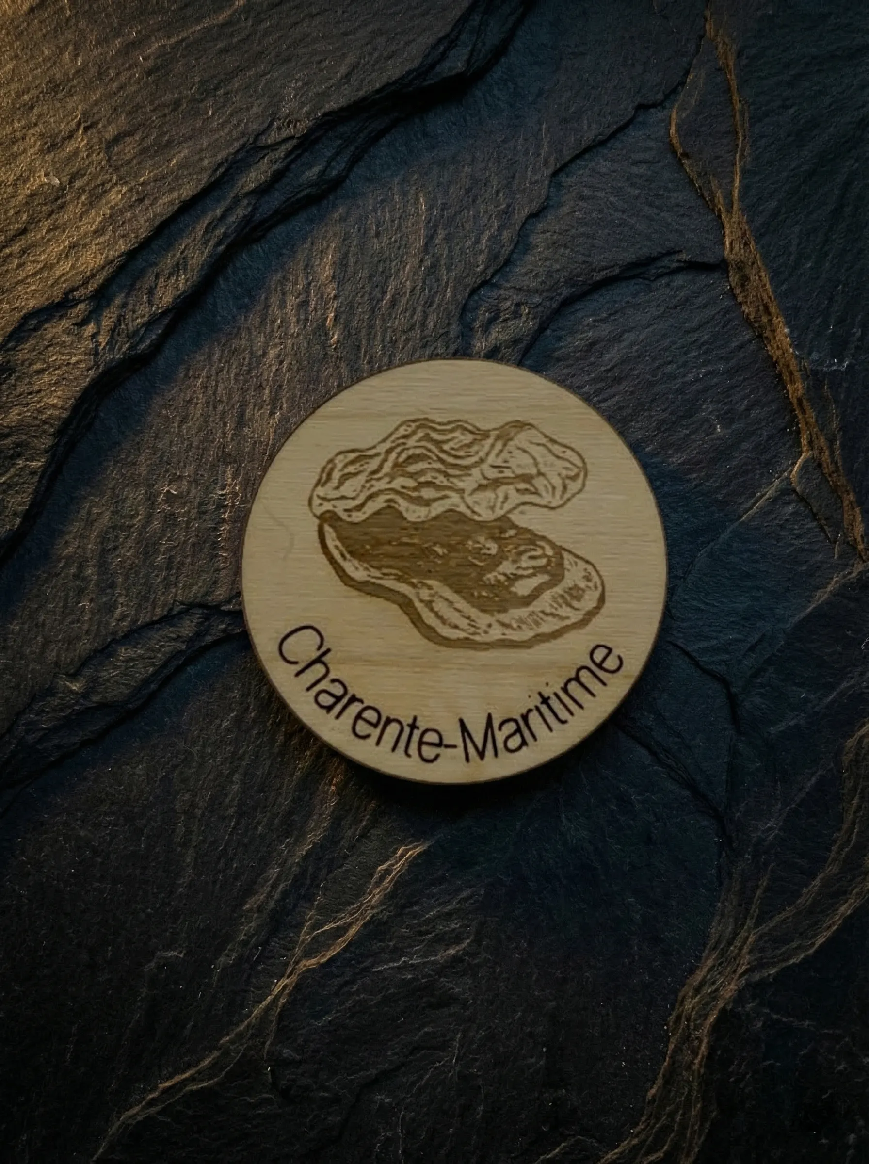 Magnet décoratif en bois de peuplier, diamètre 40 mm, épaisseur 3 mm. Gravé et fabriqué artisanalement en Charente-Maritime.