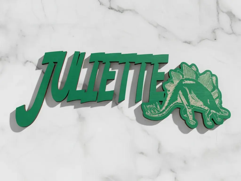 PRÉNOM DE PORTE DÉCOUPE/GRAVURE LASER DINOSAURE EN CONTRE PLAQUE 3 MM D'ÉPAISSEUR PERSONNALISABLE