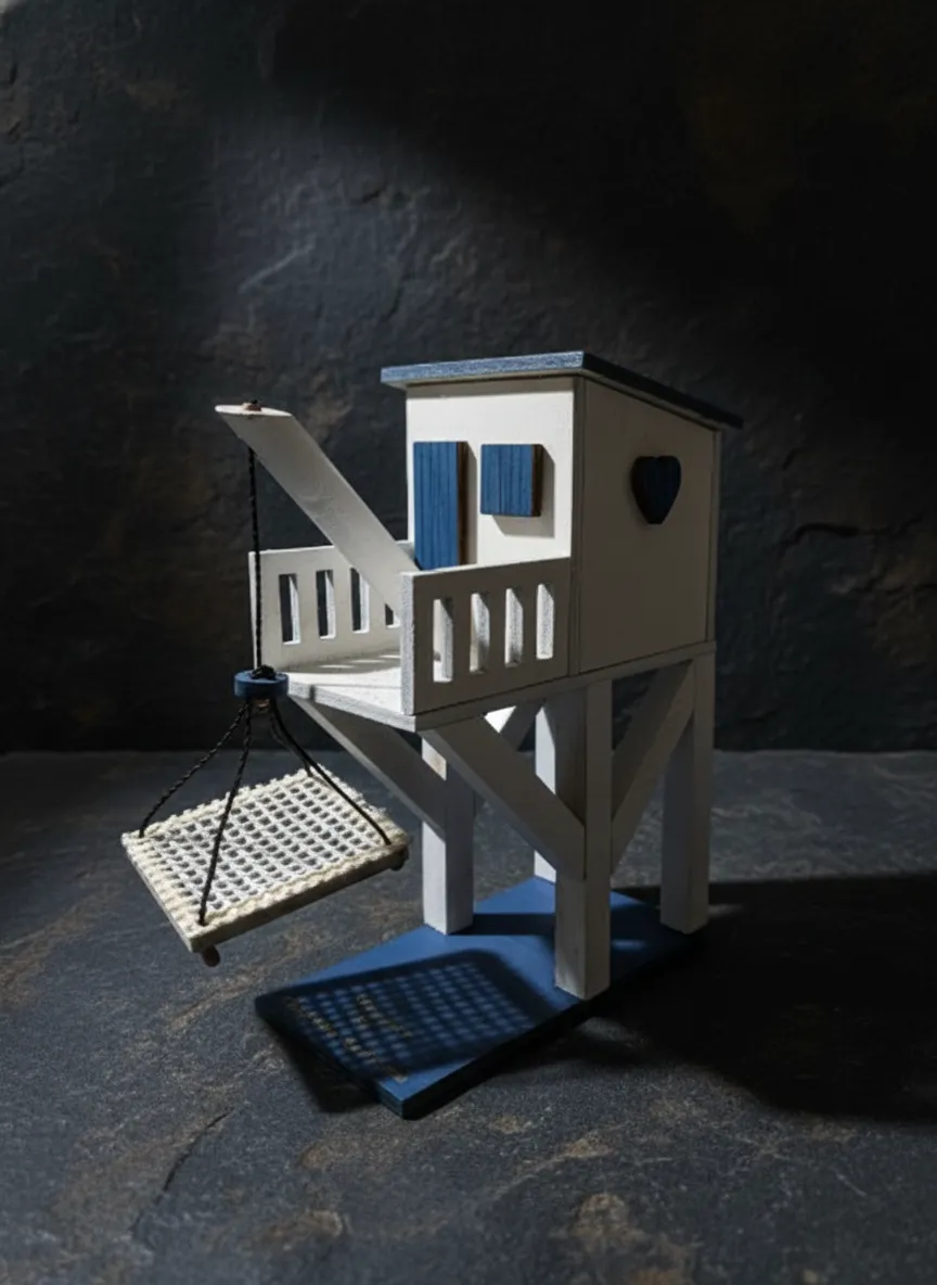 Charmante cabane à carrelet en bois de peuplier de 3 mm, fabriquée en Charente-Maritime. Assemblée et peinte à la main avec un filet en coton.